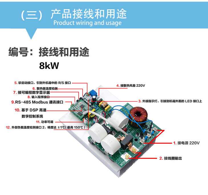 8kW/220V電磁加熱控制板是一種多用途的高效加熱節能產品,具有節電效果顯著,升溫速度快,熱效率高,降低生產環境溫度等顯著特點。本產品是采用本公司第五代數字處理平臺技術,嵌入式32位處理系統,全數字鎖相跟蹤處理。主板接口豐富,支持標準modbus RTU通訊協議,可輕而易舉實現觸摸屏人機對話、遠程控制。可廣泛應用于炒貨機,智能炒菜設備,小型管道,平面比較大功率密度加熱。效率可達98%。